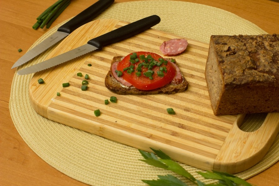 Tak więc mając do dyspozycji tzw. pikutki , których ostrza o długości 10,5 cm wykonane są ze stali nierdzewnej, przeprowadziłam prosty test. Zadanie polegało na przygotowaniu tego co robię najczęściej, czyli pysznych kanapek dla moich pociech. Wyglądające niepozornie noże ( długość 21 cm) sprawdziły się rewelacyjnie przy krojeniu pomidora, co jak wiemy może sprawić problem.